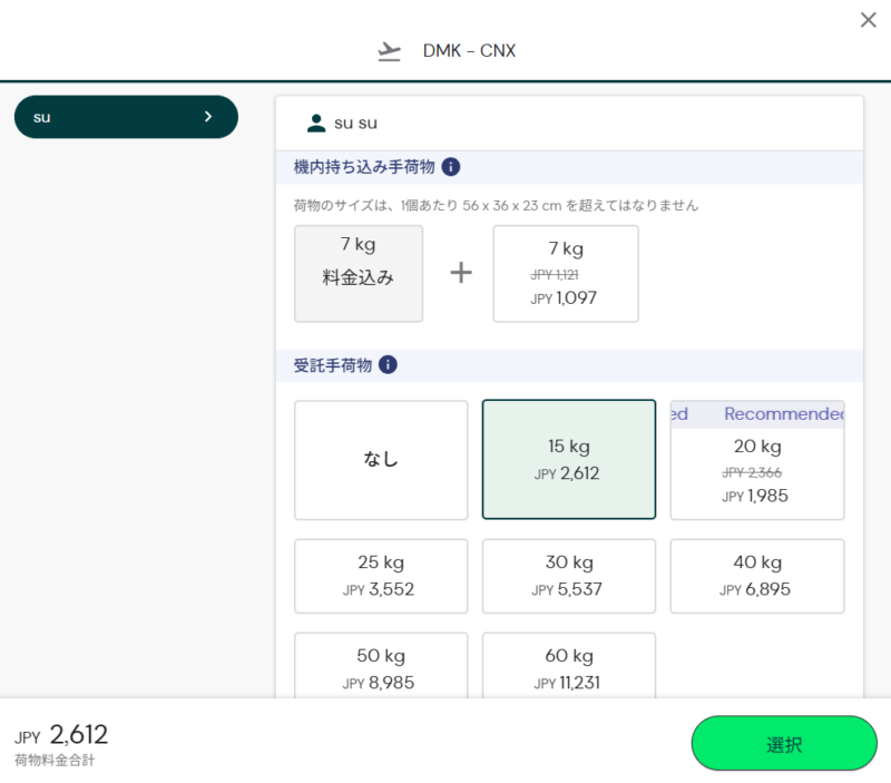 エアアジアの一番安い運賃タイプには通常預け荷物枠は無料で付属していないため、預け荷物が付いた運賃タイプを選ぶか、オプションで預け荷物枠を購入する必要があります。