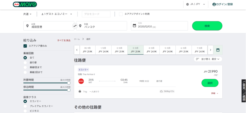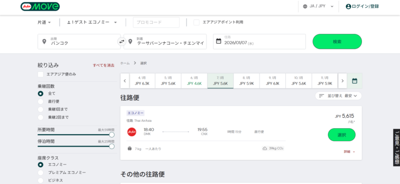 また、タイ国内線の事情も気になるところ。バンコク~チェンマイの航空券で調査してみました。