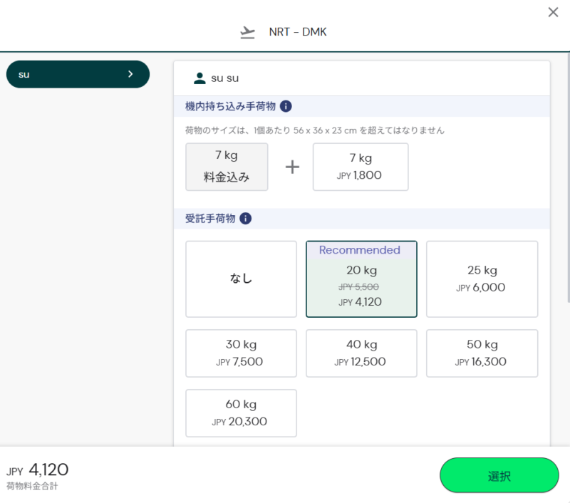 予約を進めていると、オプションで預け荷物枠を追加できる項目が出てきたのですが、受託手荷物の料金は20kgで「4,120円」。そして5kg増すごとに2,000円ずつ加算されていく具合でした。