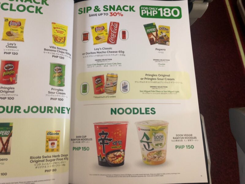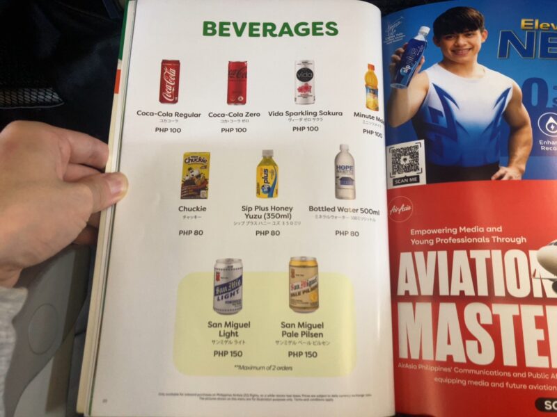 | ボトルウォーター | 機内での水分補給に欠かせないミネラルウォーター | 80ペソ | 約210円 |
