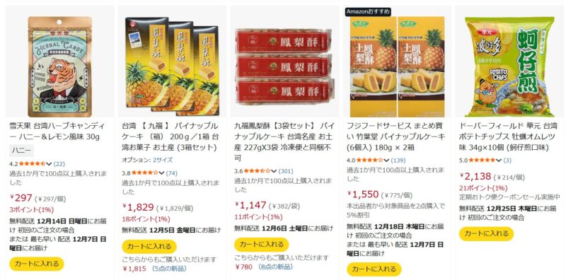 Amazonや楽天では台湾の王道グルメ・スイーツ・お菓子など、バラエティ豊富に台湾名物を発見できますよ。