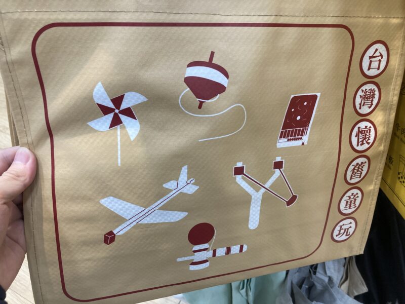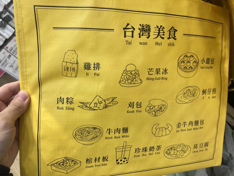 「台湾グルメ」「台湾島」「台湾おもちゃ」をそれぞれ題材にした、かわいらしいデザインのエコバッグが展開されていましたよ。自分が調査した限り、全部でこの3種類でした。