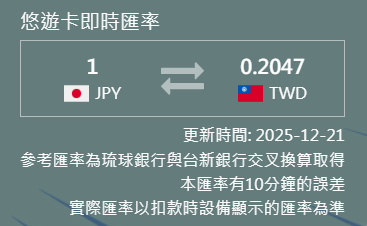 ちなみに、日本で使う際は台湾ドルで自動的に立て替えされます。レートは悠遊カードの公式サイトのホーム画面でチェックできますよ。
