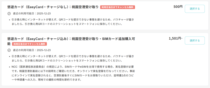 KlookやKKdayでは悠遊カードを事前予約できるほか、チャージを事前に済ませておくプランやSIMカードとのセットプランも選択できて便利です。