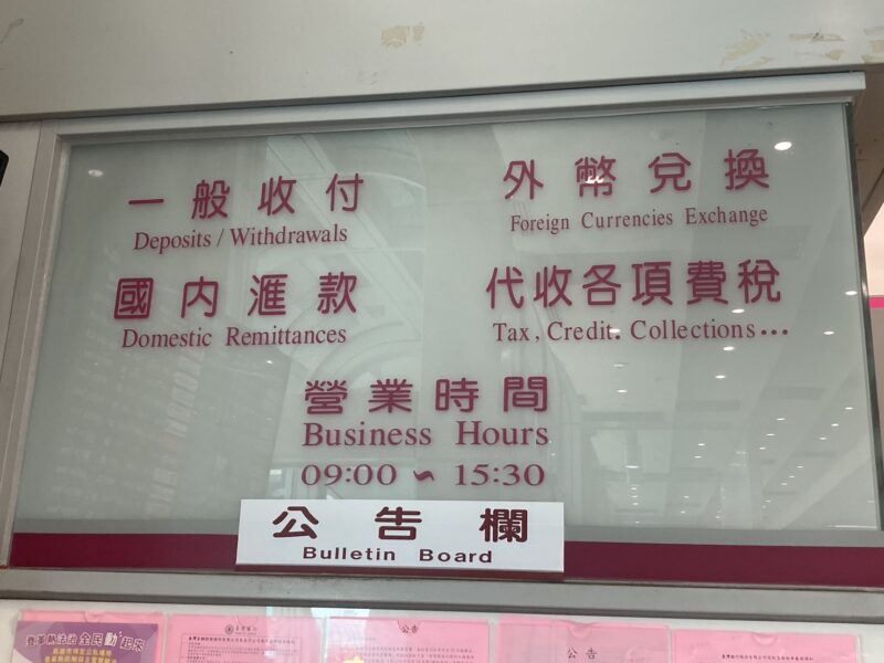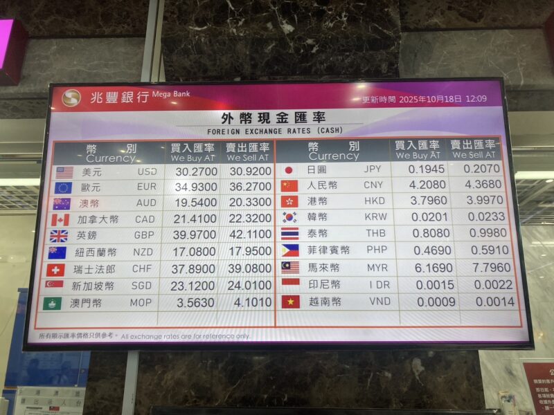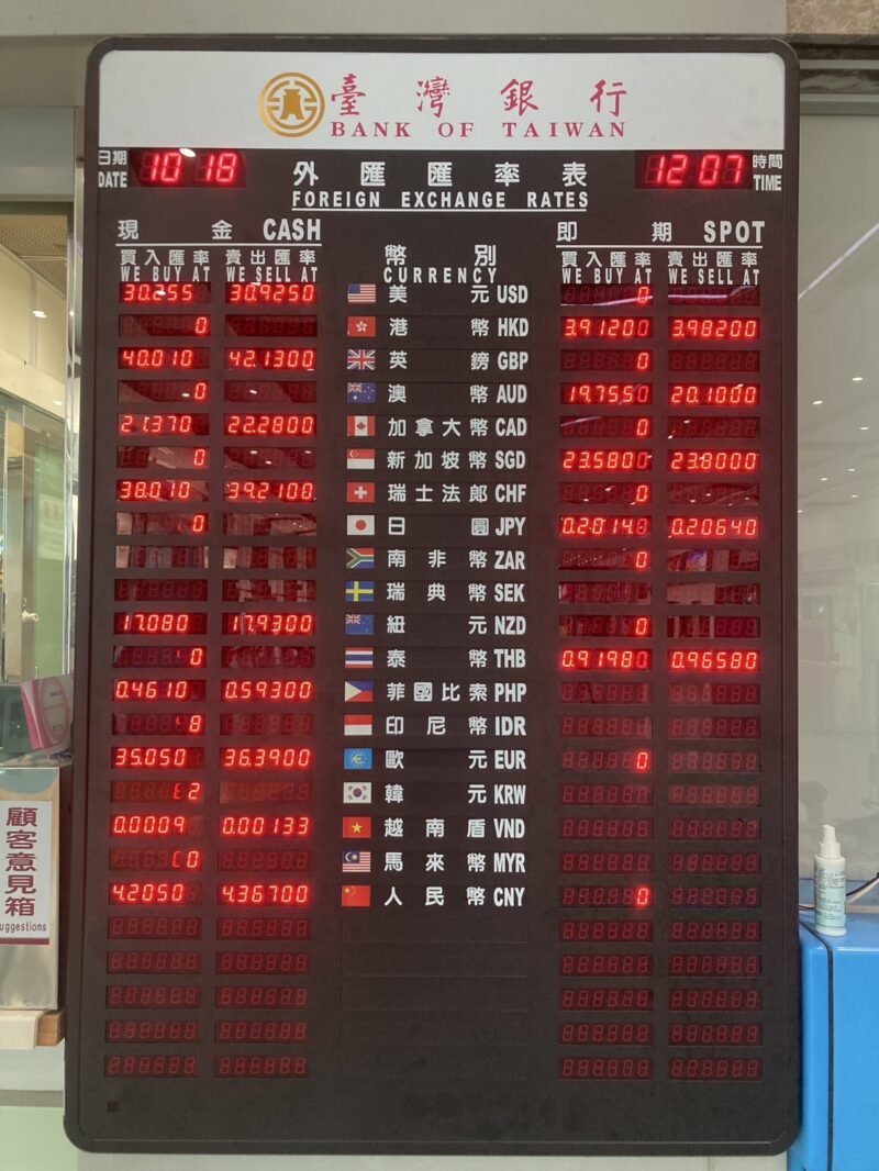 こちらは割と昔からある感じの雰囲気。右側には、各国の通貨と台湾ドルとの為替レートを表示する大きな電光掲示板が設置されていますよ。