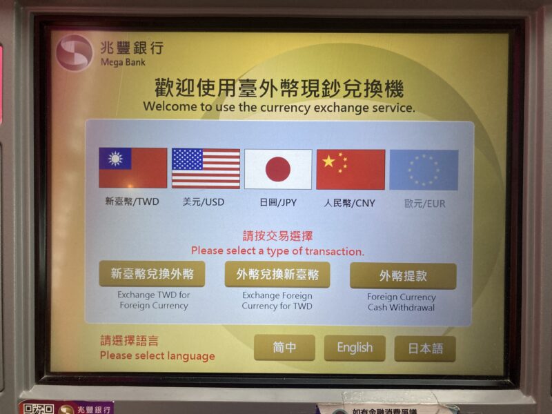 真ん中の「外幣兌換新臺幣」が、外国のお金を台湾ドルに変換する際に使います。台湾に到着時は真ん中のボタンから両替し、現地通貨を入手しましょう。