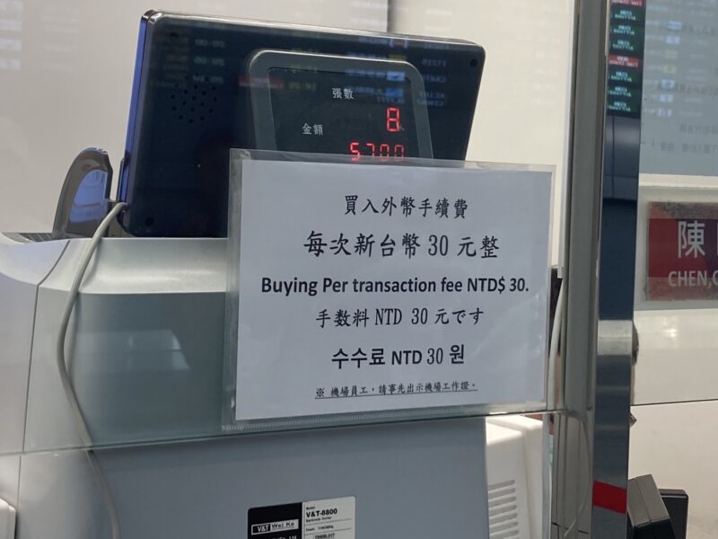 桃園国際空港で両替を行ってもらう場合、手数料として「30元(約150円)」がかかります。