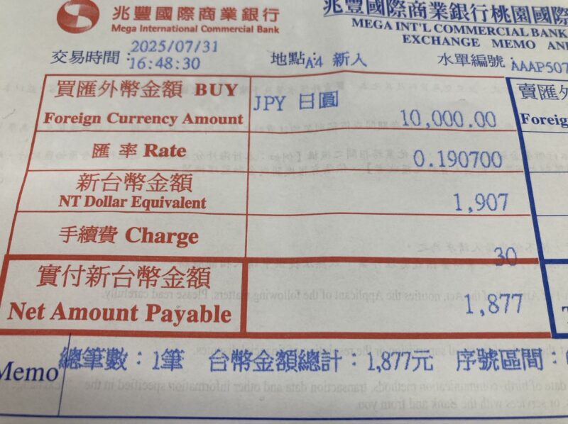 実際に桃園国際空港の兆豊銀行で両替をした際も、記載の通り30元が手数料として引かれていました。