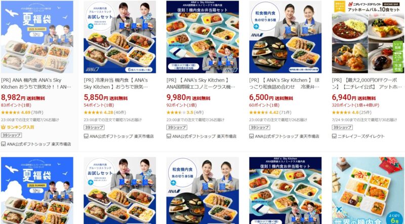 楽天やヤフーショッピングではANA公式ショップから、実際にANAのフライトで提供されている機内食を注文することができますよ。