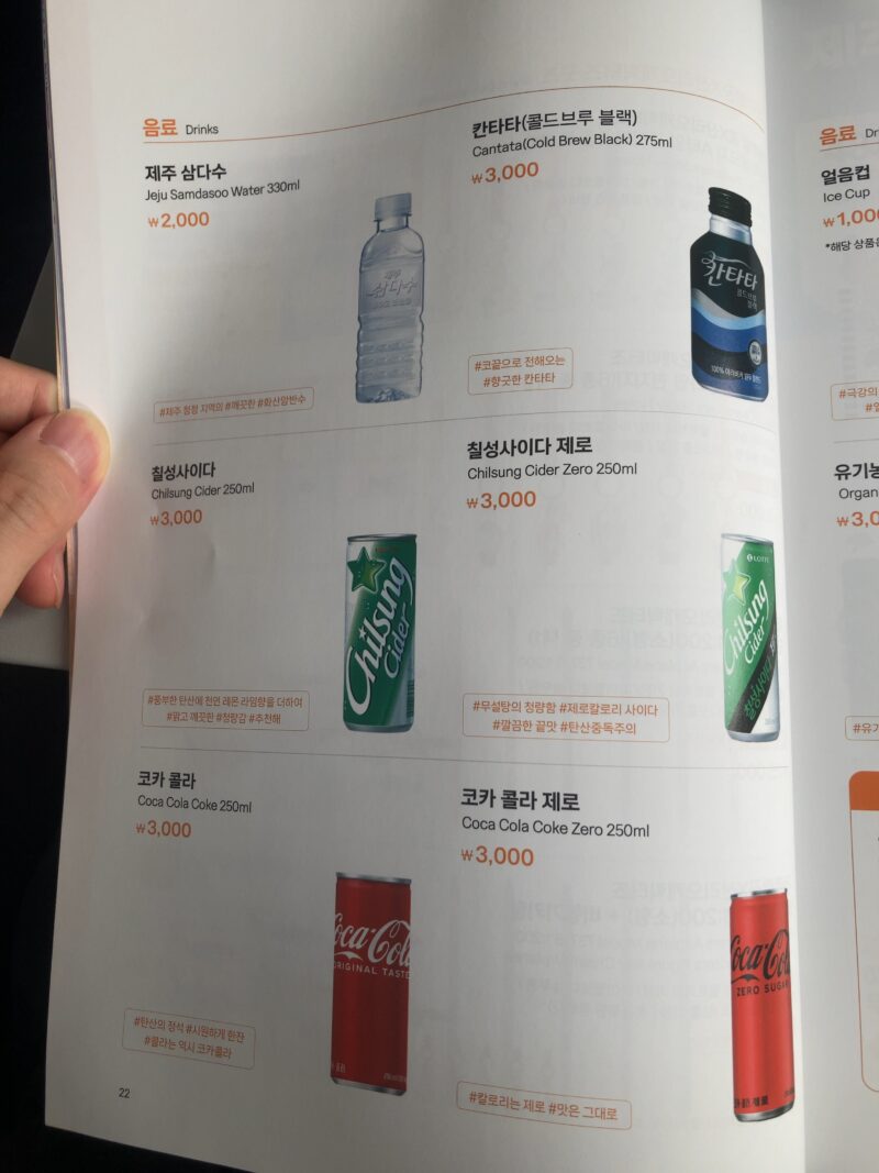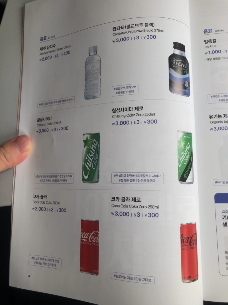 ほかにもミネラルウォーターやコカ・コーラ、そして韓国で有名な「チルソンサイダー」や「カンタータ」のコーヒーなども味わえます。