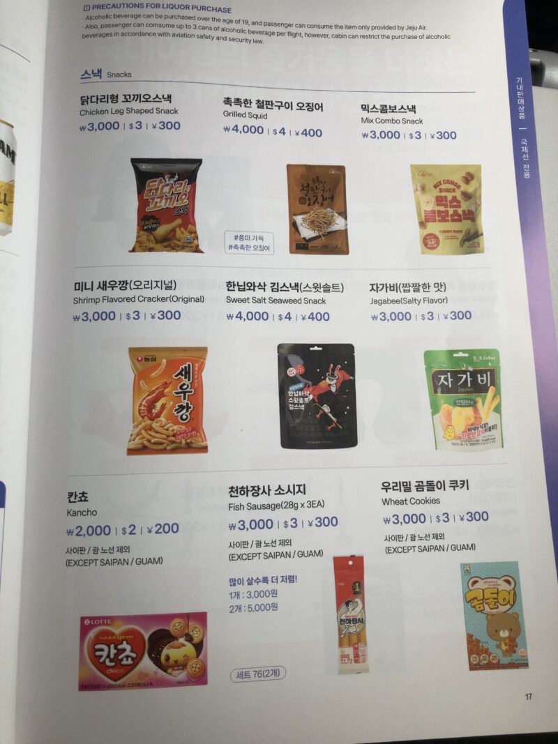 チェジュ航空の国際線では、主食からお菓子、ドリンクまで幅広いラインナップの機内食が提供されていました。