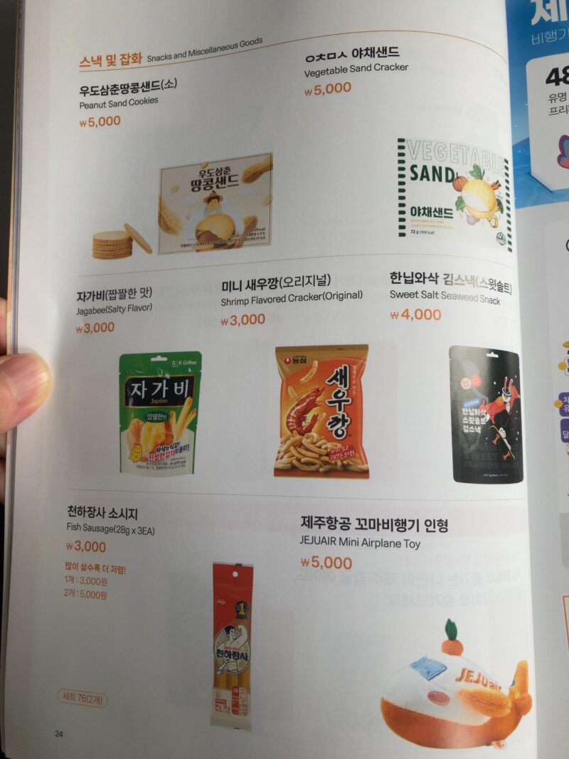 お菓子類は韓国製品が充実。おつまみにぴったりなスルメやミックススナック、韓国のかっぱえびせん「セウカン」なども注文できますよ。