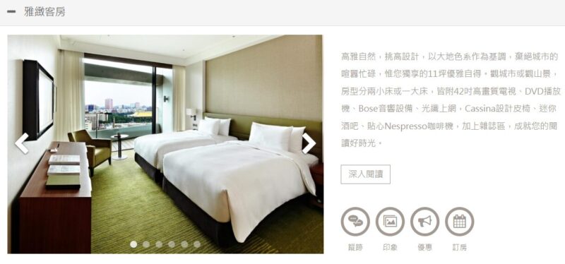 478室の客室を持ち、客室は六つのタイプに分かれており、多様な宿泊ニーズに対応。特に「ステーションスイート」と呼ばれる部屋は、台北駅の景色が望める独特のテーマデザインが施されており、宿泊客に好評です。