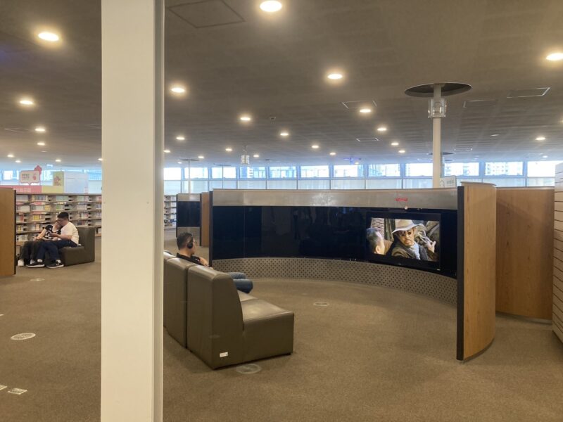 4階は通常の図書フロアに加えて、視聴覚コーナーがあるのが特徴。暑い日はこのソファでぐったりするのもおすすめですw