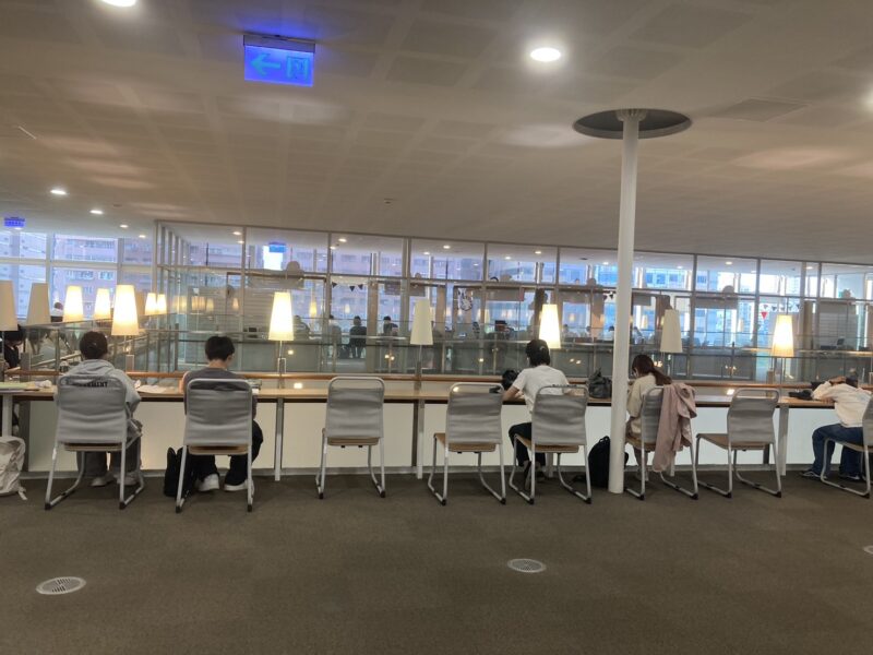 そして、3階から7階までの階にありますが、自習コーナーも設けられています。窓際にズラーっと席が並べられていて、景色を眺めながらできる作業は最高ですよね。