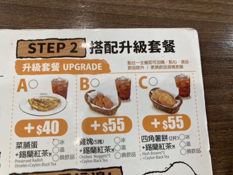 - Cセット(+ 55元):ハッシュブラウン(2枚)+錫蘭紅茶(Mサイズ)