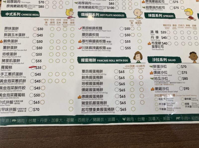 一品料理も充実しており「中式系列(中華風シリーズ)」「鐵板麵系列(ホットプレート麺)」「手捲蛋餅(パンケーキ/クレープ)」「沙拉(サラダ)」などが味わえますよ。