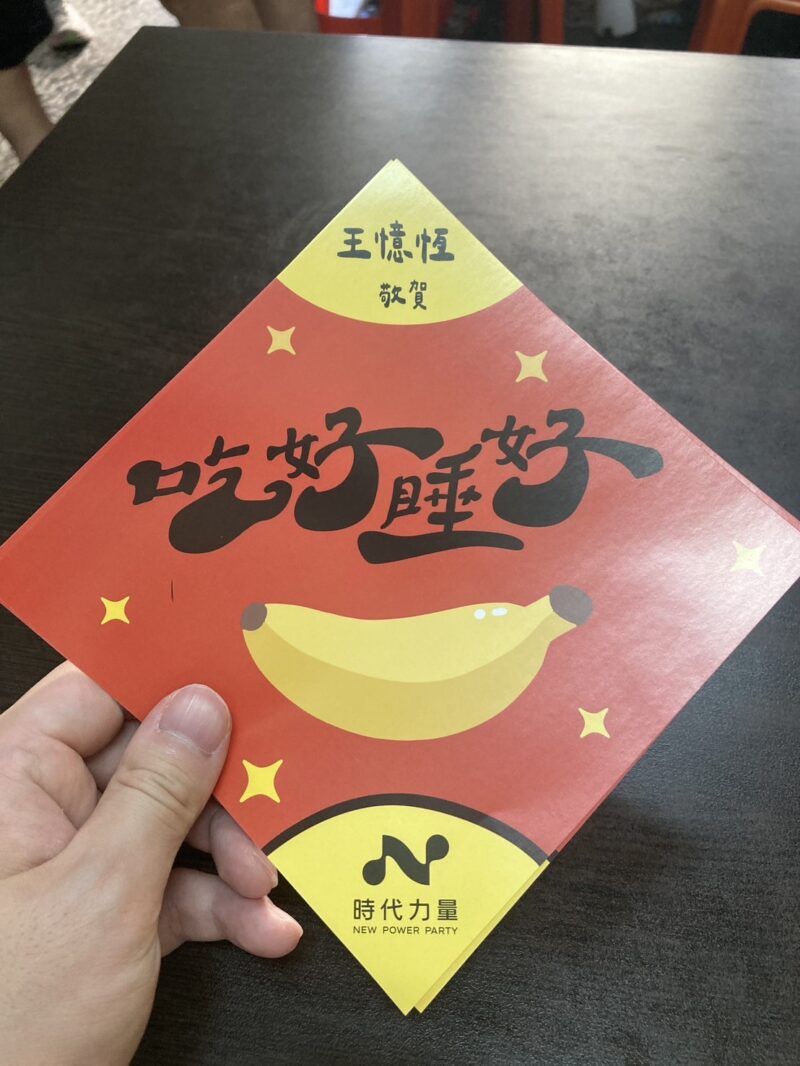 旗山で選挙活動していた方からは、旧正月の新年が近かったこともあり、日本の門松みたいな伝統的な飾りの「春聯」のバナナイラストverもいただきました。(笑)