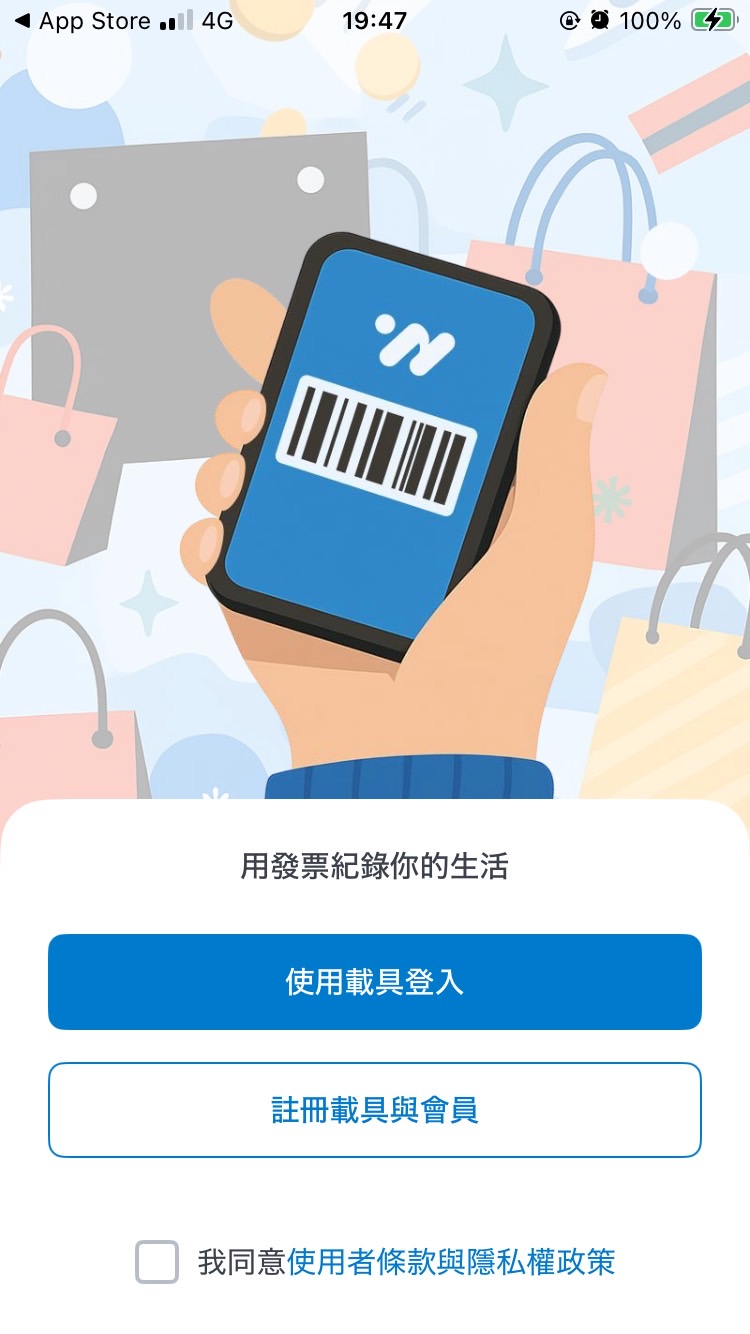 アプリを起動させると、ログイン・アカウント作成の画面が表示されるので、初めての方は同意をチェックして「註冊載具與會員(キャリアと会員の登録)」を選択しましょう。