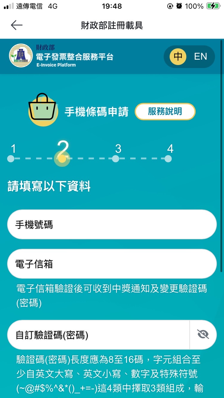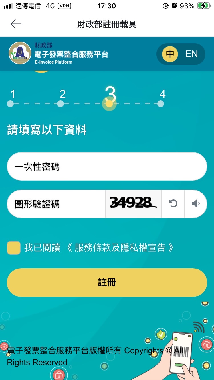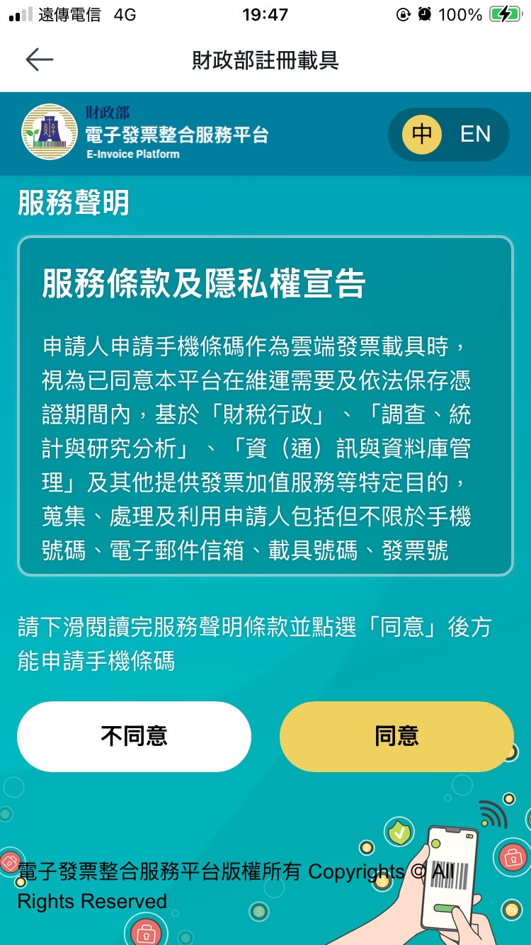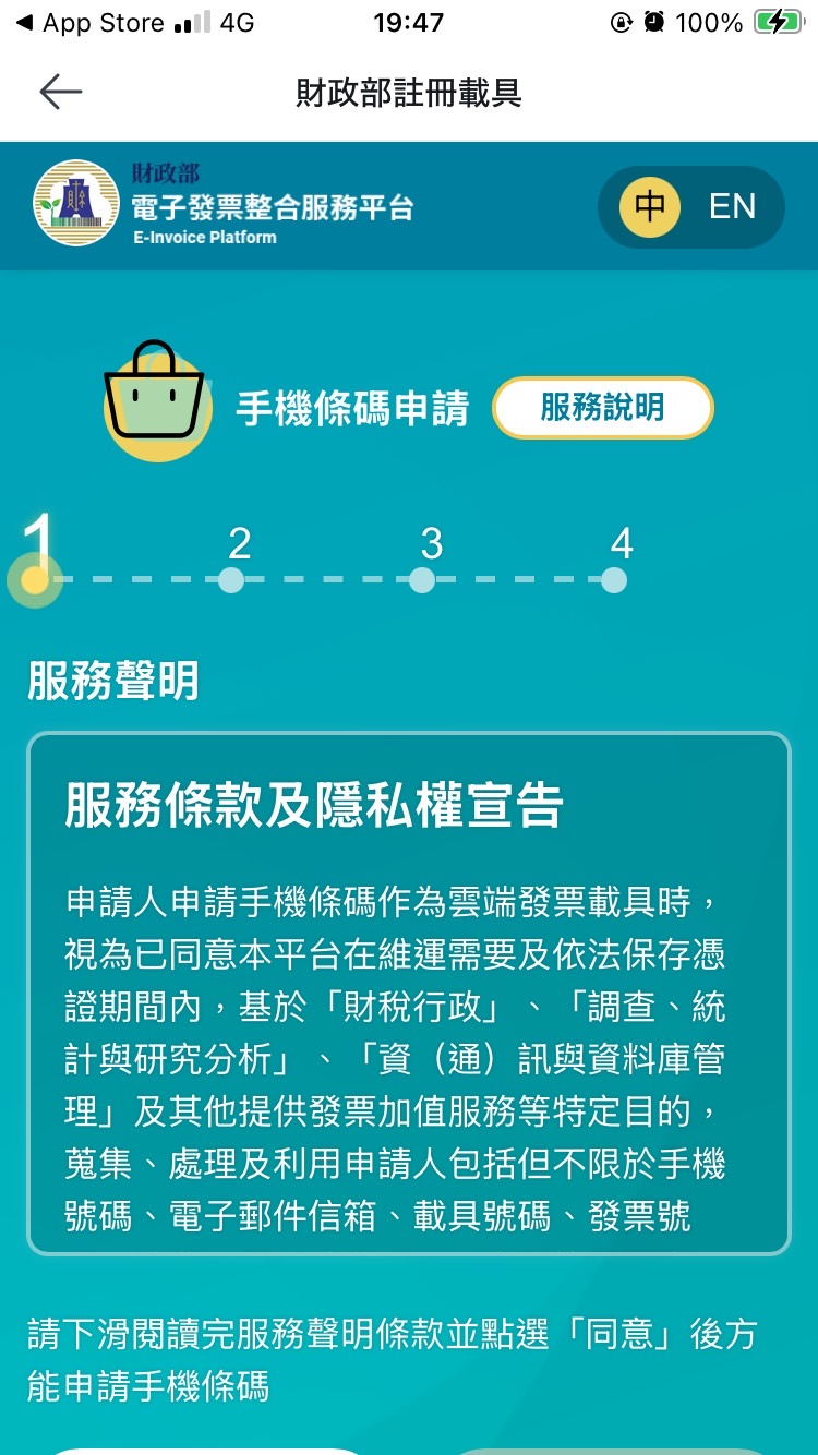 註冊載具與會員を選択すると、会員登録をするために、このアプリから財政部の公式サイトへ移行します。