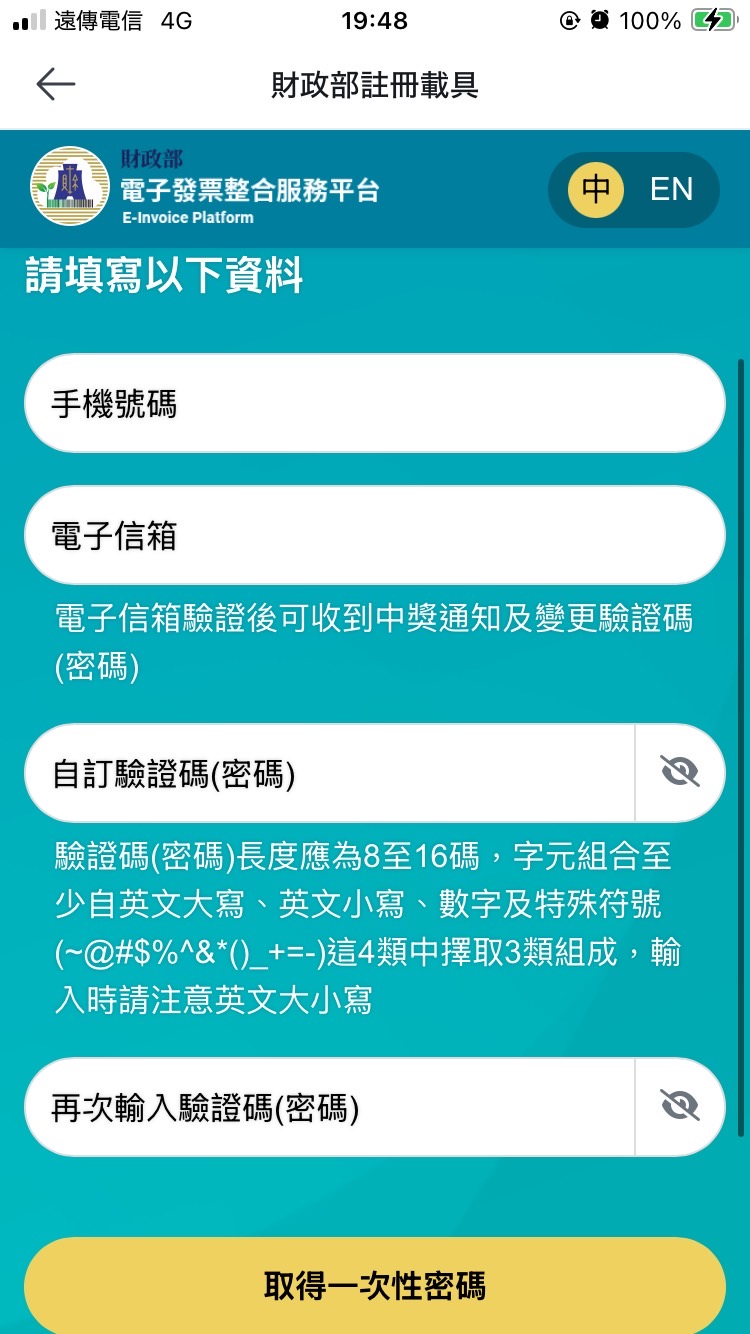 そして「再次輸入驗證碼」の箇所に同じパスワードを入れたら、「取得一次性密碼」を選択して電話番号に認証コードを送ります。