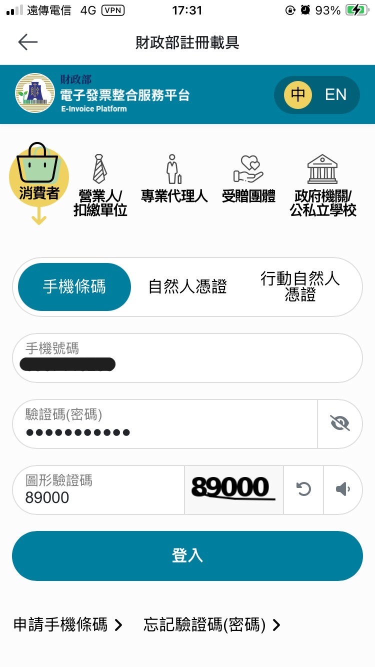 そして再び同じような画面に移りますが、ここでは既に電話番号とパスワードが入力されているので、「圖形驗證碼」のみ入力して「登入(ログイン)」をします。