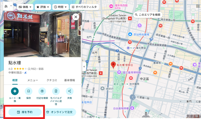 例えば、台北で有名なレストラン「點水樓」をグーグルマップで検索してみると「席を予約」というボタンが現れます。