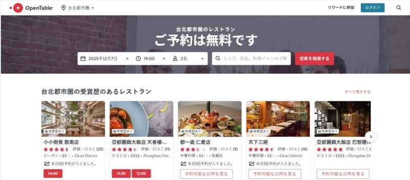 - 世界中のレストランを一括検索できる:OpenTable には世界中で多数の加盟店があり、台湾でも台北を中心に多くのレストランが登録されています。高級店からカジュアルな店まで、さまざまな選択肢から選べますよ。