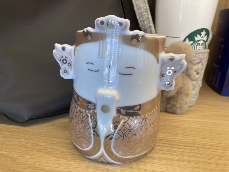 神様の穏やかな表情や豪華な衣装の文様が、金やピンクの釉薬で細かく表現されており、つい手にとってみたくなるかわいらしいデザインですよね。