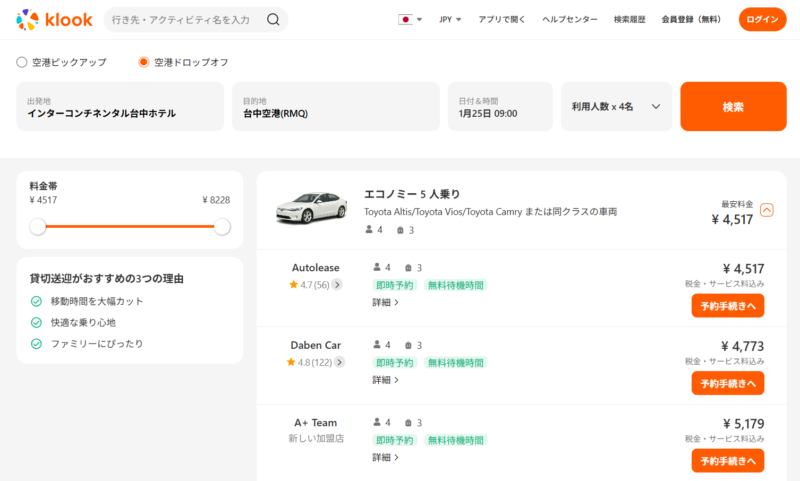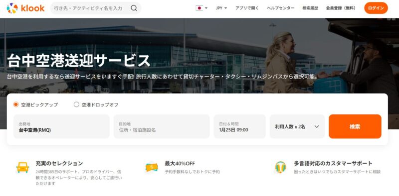 タクシーやチャーター車の利用も考えている方は、ぜひKlookの台中空港送迎サービスをチェックしてみてくださいね。