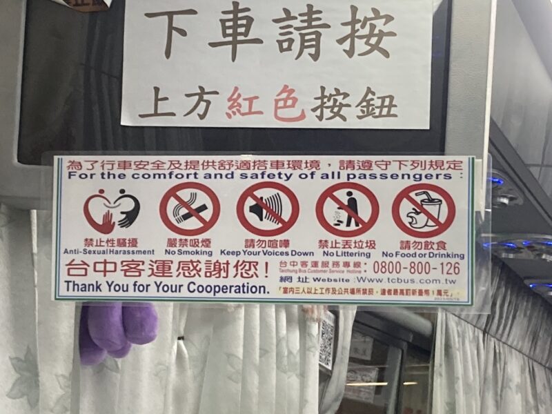 台中空港までの間にもいくつかバス停があり、次の停車駅が台中空港になったらブザーを押しましょう。