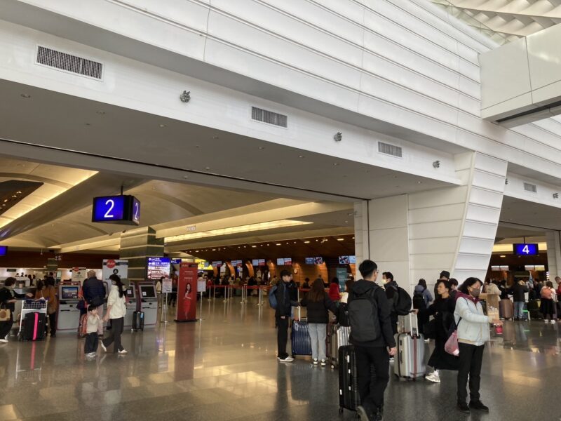 到着エリアからチェックインカウンターの並ぶ出発エリアまで移動し、エスカレーターで地下まで降りていきます。